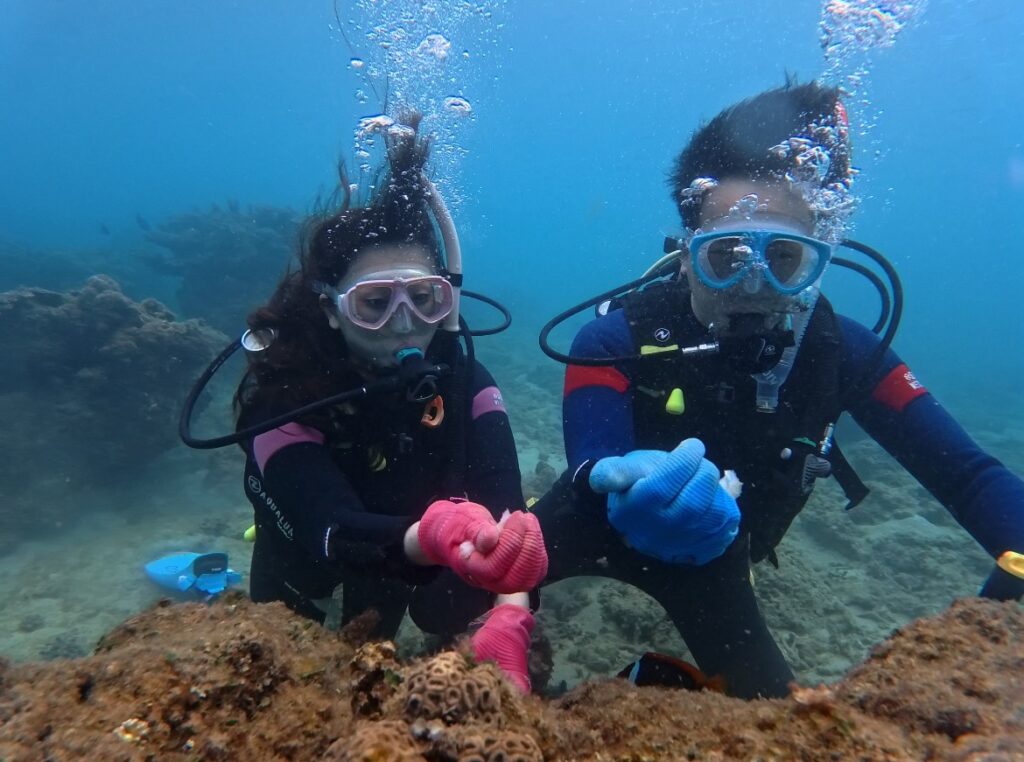 剛開始還有點不習慣呼吸器,動作也有點僵硬,但慢慢跟著教練的節奏,身體就放鬆下來了。沒有急著做什麼,只是看著海底、調整呼吸,反而更能感覺到水裡的安靜。